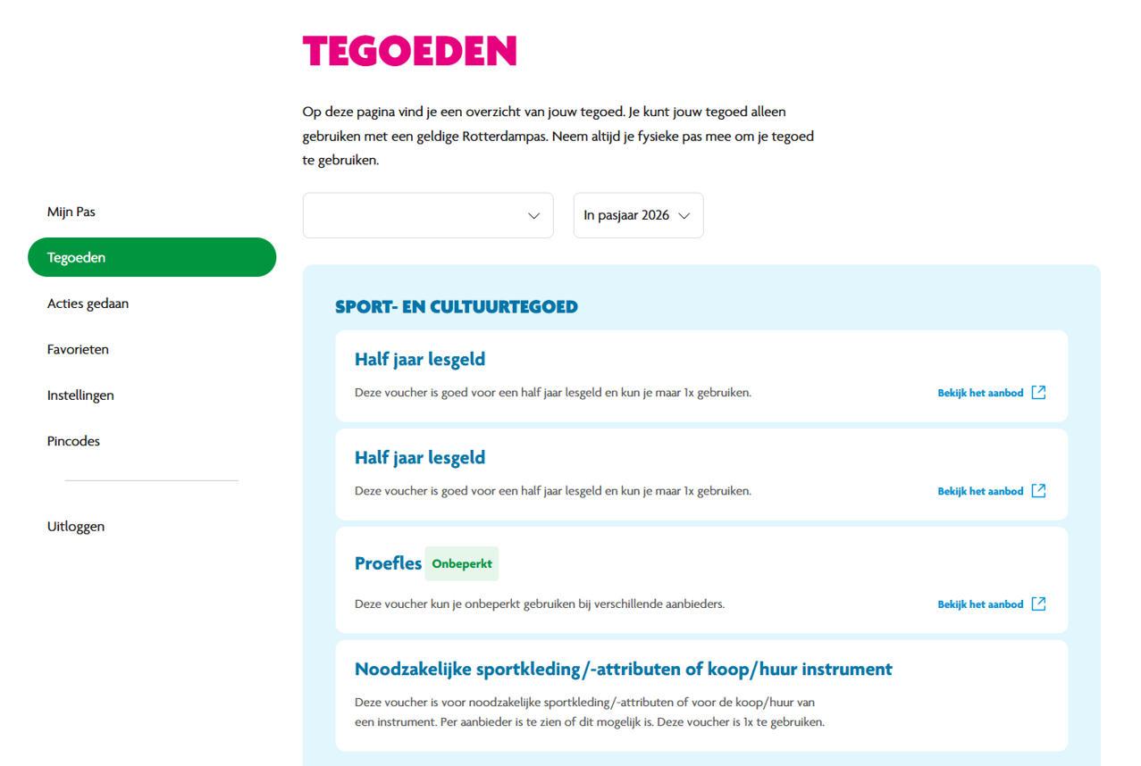 - Het tegoed bestaat uit twee vouchers (tegoedbonnen) op de Rotterdampas. Eén voucher is goed voor een half jaar meedoen aan sport- of cultuurlessen. Door twee vouchers in te wisselen, kan uw kind dus een jaar lang meedoen.